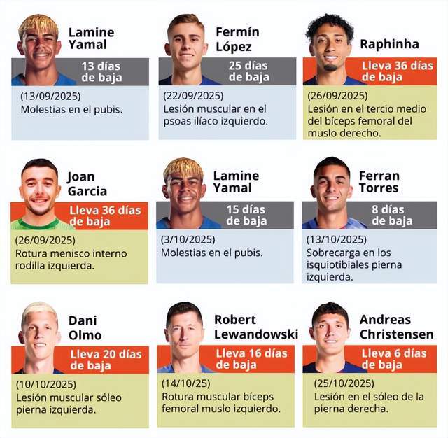 特尔施特根已经休战93天;8月份,莱万多夫斯基受伤休息15天、奥尔莫休战一周;8月底,加维休战2个月。进入9月份,巴萨的伤病潮更为严重,巴尔德、德容、亚马尔、费尔明、拉菲尼亚、霍安-加西亚6人受伤!